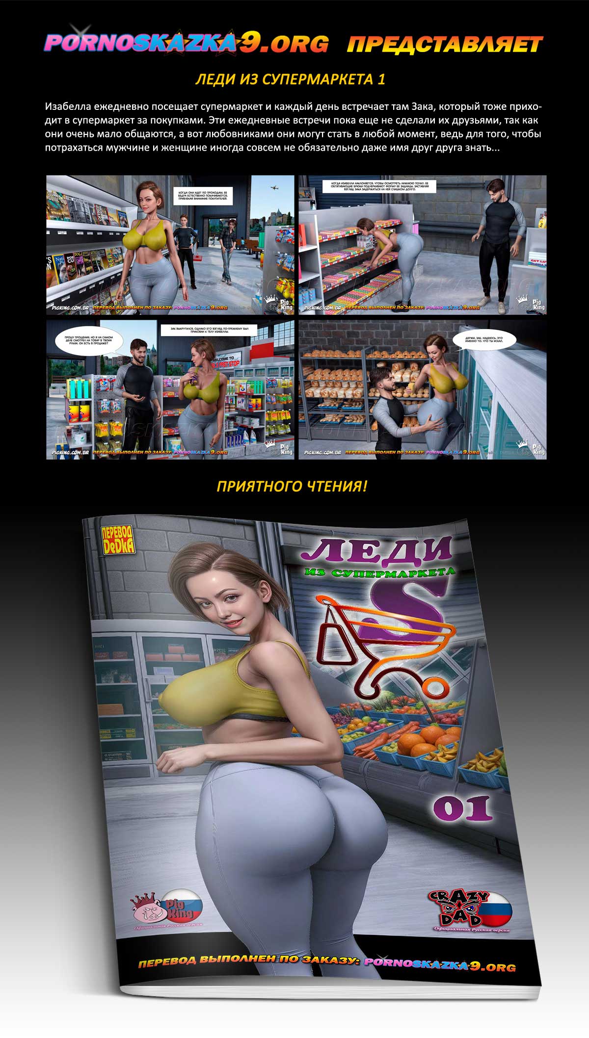 Порно комикс «Леди из супермаркета. Часть 1.». Изабелла ежедневно посещает супермаркет и каждый день встречает там Зака, который тоже приходит в супермаркет за покупками. Эти ежедневные встречи пока еще не сделали их друзьями, так как они очень мало общаются, а вот любовниками они могут стать в любой момент, ведь для того, чтобы потрахаться мужчине и женщине иногда совсем не обязательно даже имя друг друга знать…