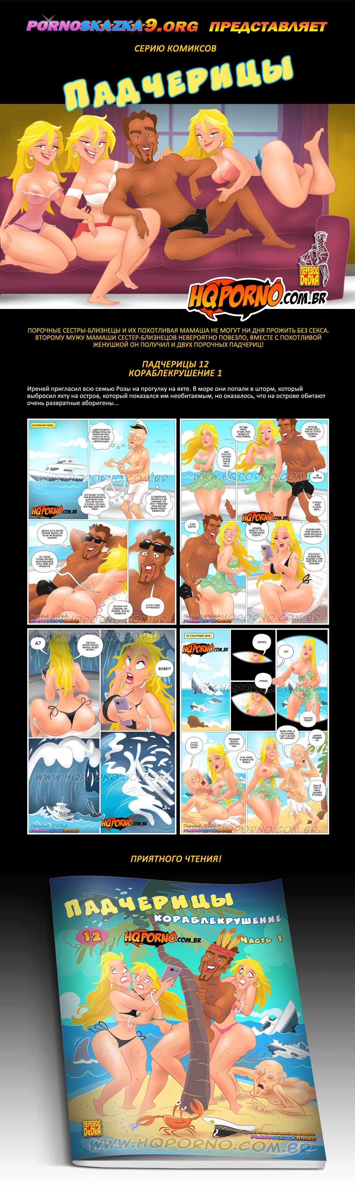Порно комикс «Падчерицы. Часть 12: Кораблекрушение 1.» Иреней пригласил всю семью Розы на прогулку на яхте. В море они попали в шторм, который выбросил яхту на остров, который показался им необитаемым, но оказалось, что на острове обитают очень развратные аборигены…