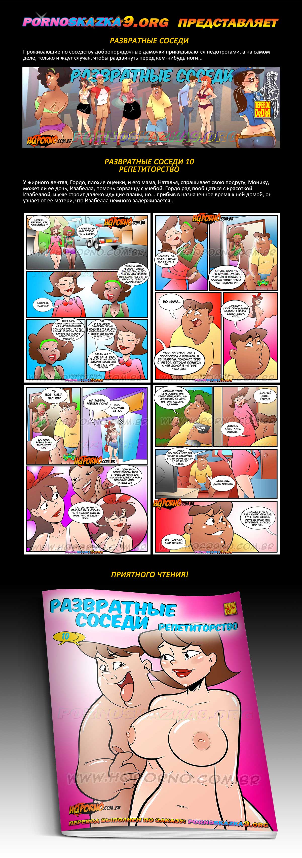 Порно комикс «Развратные соседи. Часть 10: Репетиторство.» У жирного лентяя, Гордо, плохие оценки, и его мама, Наталья, спрашивает свою подругу, Монику, может ли ее дочь, Изабелла, помочь сорванцу с учебой. Гордо рад пообщаться с красоткой Изабеллой, и уже строит далеко идущие планы, но… прибыв в назначенное время к ней домой, он узнает от ее матери, что Изабелла немного задерживается…